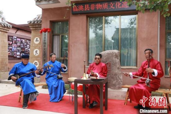 10月12日,甘肅省定西市臨洮縣舉行非物質(zhì)文化遺產(chǎn)展示中心啟動儀式。圖為當(dāng)?shù)仄び皯騻鞒腥粟w學(xué)兵(右二)帶領(lǐng)班社表演影子腔?!堟?nbsp;攝
