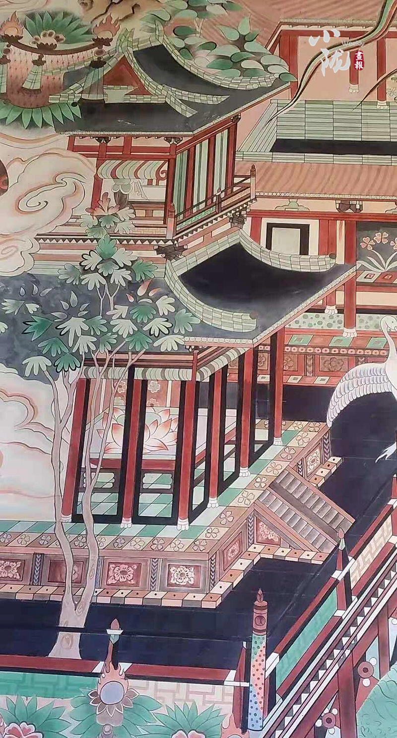 畫面的后方是亭臺樓閣,回廊里,左邊是白鶴展開雙翅,嘴里好像發(fā)出美妙的聲音,迦陵頻伽人身鳥尾,雙手弄拍展翅而舞,尾如卷云漩渦。回廊右邊,共命鳥一身二頭,展翅而舞,孔雀輕歌曼舞,展翅回首,還有翩翩起舞的鸚鵡,他們是能為人言而美麗的祥鳥,他們的聲音能增進(jìn)人們善德的力量,促進(jìn)人們早日進(jìn)入想象的幸福世界。