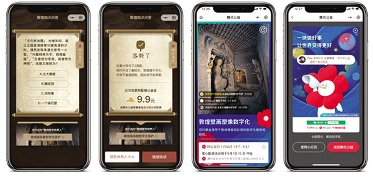 “云游敦煌”的“聲動畫語”讓壁畫“活”了起來,用戶可以通過觸點的方式進入到不同的篇章中,通過動畫欣賞敦煌壁畫中晚唐時期的生活場景,并獲得與當時社會民俗、服飾等相關的文化知識。觀看完動畫后,用戶還可以通過參與文化問答挑戰(zhàn),為中國敦煌石窟保護基金會募集善款。答對題目越多,募集到的善款也將隨之增多??铐棇⒂沈v訊公益慈善基金會直接出資,并全部用于敦煌莫高窟第427窟、145窟、138窟的數(shù)字化保護工程。通過這種方式讓每一位參與的用戶,都能夠用自己的知識為石窟數(shù)字化保護助力,成為新時代的敦煌“數(shù)字供養(yǎng)人”。