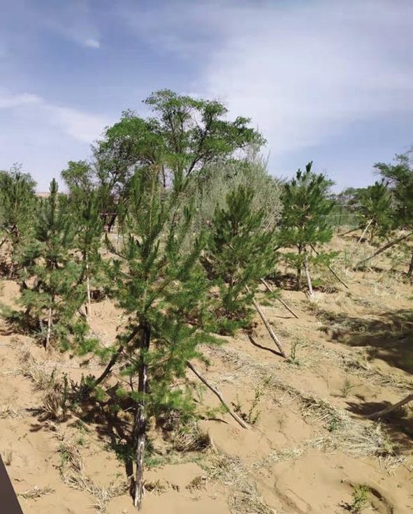 我和同伴撲進(jìn)沙海柔軟的懷抱。認(rèn)識(shí)到,再小的沙粒,也不能與塵世隔絕,我與沙,結(jié)緣于此。沙海里,一沙一世界。黃沙大膽赤裸地暴露在天幕蒼芎下,以大,以小,涵納無(wú)窮。“沙沙”的足音里,印下我深深淺淺兩行腳印,宣告著浪漫與踏實(shí)的存在。我來(lái)到習(xí)近平總書(shū)記親手栽植的“五棵松”下,仰視青松,綠云葳蕤,生機(jī)勃勃。總書(shū)記的關(guān)懷和鼓勵(lì),黃沙熱熱地、輕輕地長(zhǎng)出了更多綠色羽翼,這羽翼在不斷地生長(zhǎng)壯大,有“代代相傳”的精神,綠色終究會(huì)覆蓋全部騰格里。捧起一捧黃沙,細(xì)沙像嬰兒肌膚般的柔滑,我試圖用臉貼近它,這些黃色的小精靈,從我指縫間輕盈地流淌到松下,似乎在暗示我,要把自己的夢(mèng)筑進(jìn)治沙精神的瀚海里。科學(xué)家們已作出結(jié)論:沙漠是人類(lèi)最后的寶地,別看它現(xiàn)在荒蕪,它里面蘊(yùn)藏著無(wú)盡的寶藏和財(cái)富。