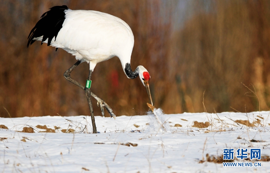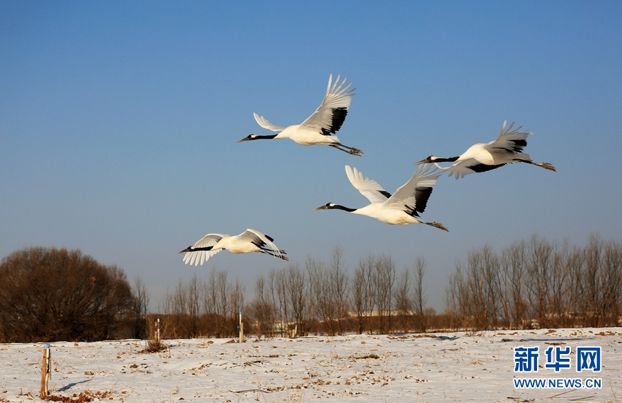2月14日,雪后初晴,甘肅省張掖國家濕地公園放飛的十余只丹頂鶴翩翩起舞、嬉戲覓食,使雪后的濕地公園充滿生機(jī)。新華網(wǎng)發(fā)(陳禮 攝)