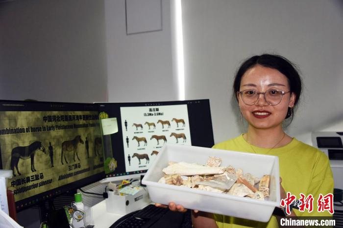 馬姣在辦公室展示介紹用于本次研究的部分馬化石樣品?!≈行律缬浾?nbsp;孫自法 攝