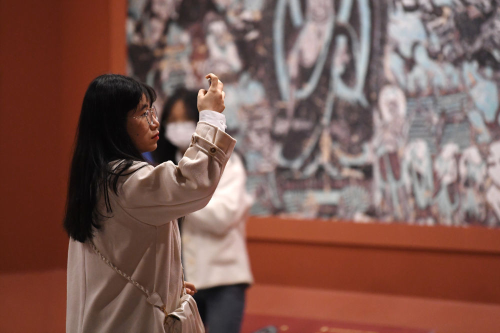 當(dāng)日是清明節(jié)假期,眾多市民和游客來到位于蘭州黃河岸邊的敦煌研究院蘭州分院敦煌藝術(shù)館參觀“打卡”,欣賞“覺色敦煌 莫高精神”敦煌石窟藝術(shù)展,近距離感受敦煌文化藝術(shù)的魅力。
