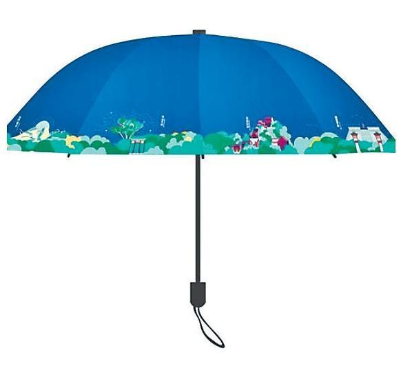 畫面是對(duì)天水文化的整合轉(zhuǎn)譯。靜謐的深藍(lán)夜色宛如舒緩溫柔的吟唱,點(diǎn)醒具有暗語的想象。連綿起伏的綠影又將目不暇接的八美之景串聯(lián)起墜于傘邊沿,呈現(xiàn)一種清新淡雅的格調(diào)。四字榜題作為光影與畫面間的調(diào)和劑潤(rùn)化了視覺美感,使空間溢滿文人逸趣。簡(jiǎn)潔平穩(wěn)的畫卷里隱含古雅山水的形象,靈動(dòng)漂浮的畫卷里創(chuàng)立起意蘊(yùn)美學(xué)。