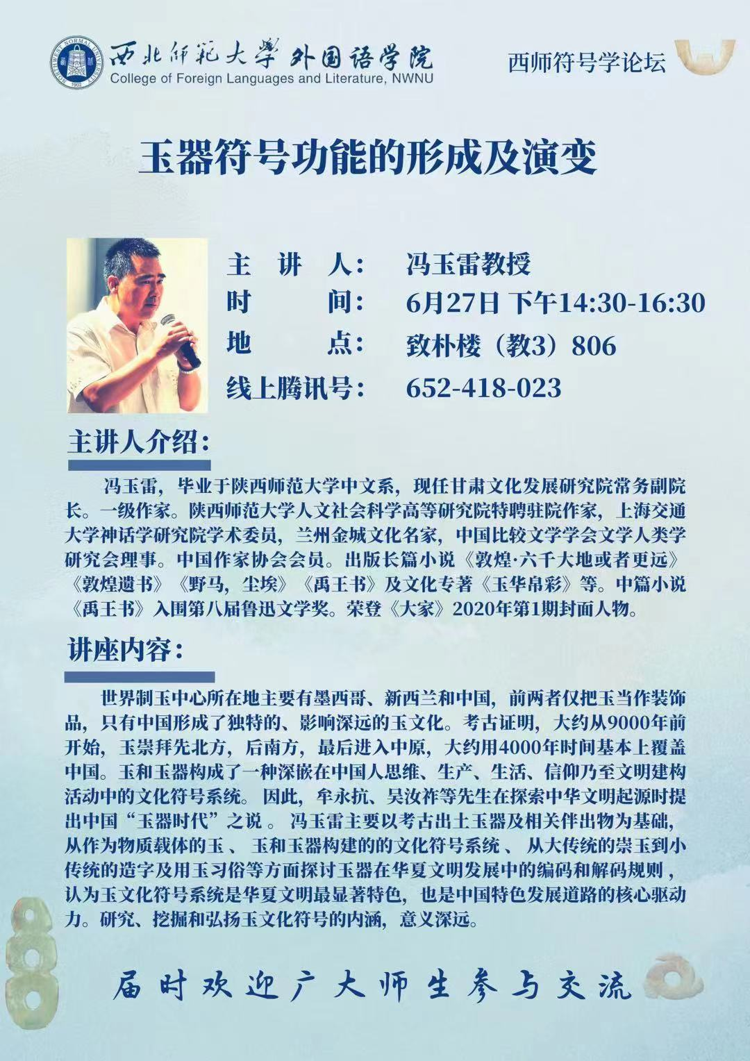 由甘肅文化發(fā)展研究院常務(wù)副院長、一級(jí)作家馮玉雷主講的《玉器符號(hào)功能的形成及演變》將于6月27日下午在西北師范大學(xué)舉辦。此項(xiàng)活動(dòng)是西北師范大學(xué)外國語學(xué)院西師符號(hào)學(xué)論壇系列講座之一,旨在促進(jìn)玉文化與符號(hào)學(xué)的融合研究。