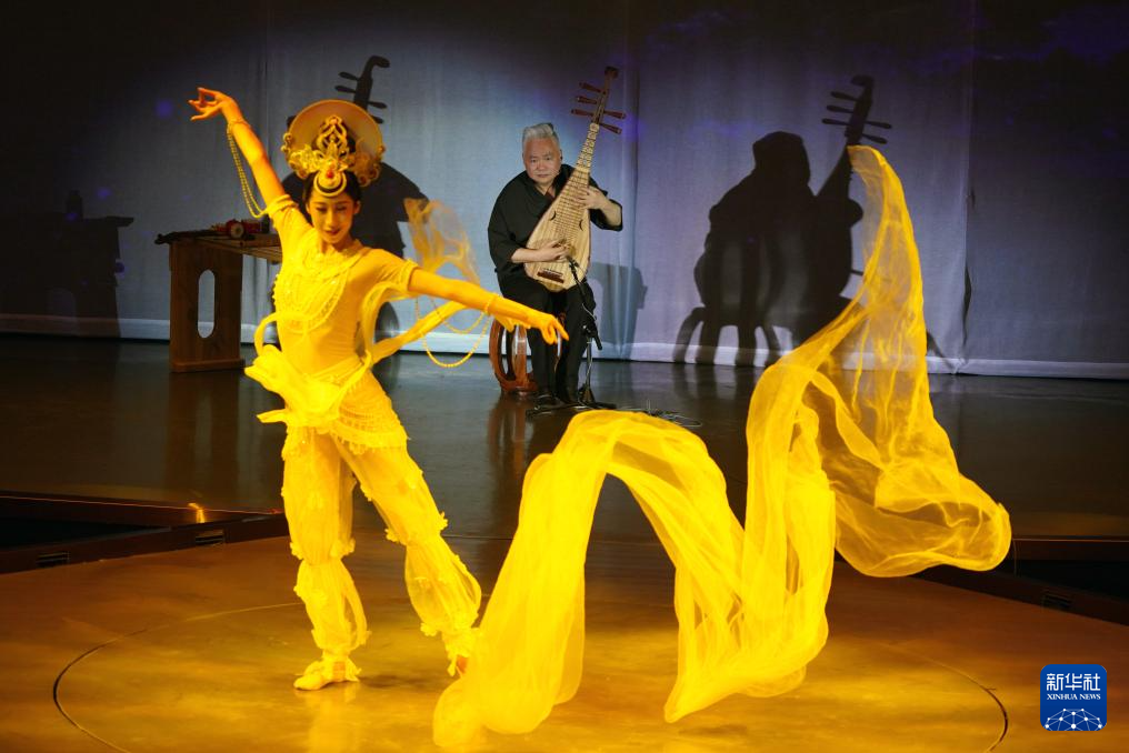 8月9日,在《樂(lè)動(dòng)敦煌》演出現(xiàn)場(chǎng),敦煌古樂(lè)全球推廣大使、國(guó)樂(lè)藝術(shù)家方錦龍演奏琵琶,為舞蹈演員伴奏。新華社記者 馬寧 攝