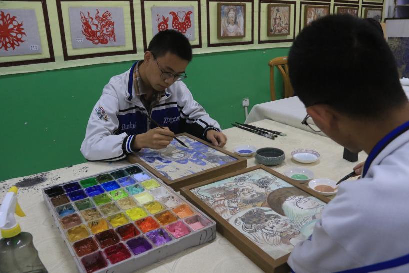 敦煌中學(xué)的學(xué)生在學(xué)校畫室里臨摹敦煌壁畫。張曉亮 攝