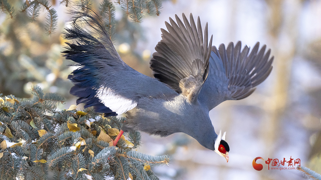 冬日里,藍馬雞成群飛落山腳覓食,藍羽丹頂行走在雪地格外搶眼。覓食時,藍馬雞常用爪刨挖林中空地苔蘚和林緣草地,尋找掉落的云杉種子,刨食的過程會使土壤裸露出來,便于云杉種子生根發(fā)芽,促進云杉林天然更新。