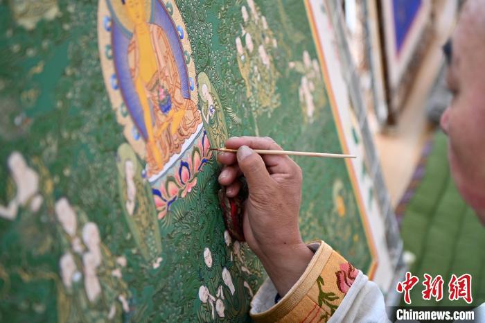 圖為交巴加布展示以拉卜楞寺為主題的唐卡作品。交巴加布不僅繼承了傳統(tǒng)唐卡技藝,更在創(chuàng)新中展現(xiàn)了個人特色。他結(jié)合現(xiàn)代審美和繪畫技巧,使作品既保留了傳統(tǒng)的韻味,又具有鮮明的現(xiàn)代氣息。這種獨特的藝術(shù)風(fēng)格使他的作品在眾多唐卡中脫穎而出,成為藏族民眾和藝術(shù)愛好者爭相收藏的藝術(shù)珍品。九美旦增 攝