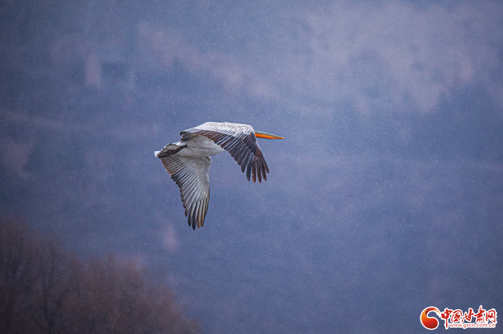 當(dāng)天,天空下著大雪,天氣寒冷,一位野生鳥類攝影愛好者驚喜地在崇信縣汭河段發(fā)現(xiàn)了一只卷羽鵜鶘盤旋于河道上空,經(jīng)過跟蹤其降落于發(fā)現(xiàn)地20里外的銅城水庫附近水域,與蒼鷺混群。