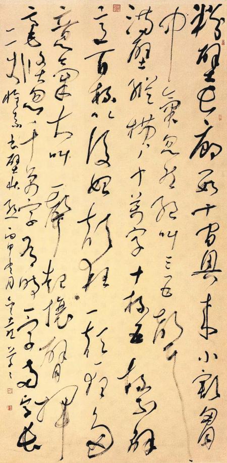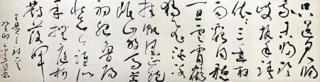 走出去,站在全國的高度,集中進(jìn)行學(xué)習(xí)和交流,對一個立志進(jìn)取的書法家,可以說是一個脫胎換骨的修煉,中國書法發(fā)展的當(dāng)代狀態(tài),成為進(jìn)取的最大參照,風(fēng)格極力貼近時代風(fēng)尚,在此基礎(chǔ)之上加入個人的鮮活語素,在作品中即表現(xiàn)出了時尚,又有自己的構(gòu)想,才有自己的一席之地。侯金喜抓住時代脈搏,積極捕捉在展覽中尚處于不顯眼的元素,不斷加以顯化,使個人的作品在龐大的展出體系中獨(dú)具風(fēng)采,難度可想而知,在高手如林的態(tài)勢下,侯金喜知難而上、刻苦磨煉,向經(jīng)典取法,向當(dāng)代名家問路,雙向融合、求新求變,經(jīng)過了這樣一個長的時段的求索,他的草書在全國眾多的草書家中拔地而起,引發(fā)了廣泛的關(guān)注??此牟輹兓亩劝盐赵诹艘粋€比較妥帖的度上,他不以奇異詭變?yōu)槌缟校P畫塑造大體以傳統(tǒng)語言為宗,使柔和與剛健統(tǒng)馭在一起,這種立意基本圍繞中國書法流變的中軸線,可以受到時間的考驗(yàn),在一些筆畫中注入的時代信息,經(jīng)過個人的藝術(shù)提煉,具有了新的生氣。在結(jié)構(gòu)選擇上,他同樣進(jìn)行了深思熟慮,反復(fù)篩汰了過度追求時髦的招數(shù),一直強(qiáng)調(diào)深層次的內(nèi)涵,把一個結(jié)體放在歷史的縱向上反復(fù)琢磨,他自己認(rèn)為,形象造型只有沿著時序的推進(jìn),才能有機(jī)地融入歷史,成為藝術(shù)的終極選擇,所以侯金喜的探索是審慎的,邁進(jìn)是疊復(fù)的,我們欣賞他的作品,可以看出他思考的勤謹(jǐn),每一個階段都有不同的表達(dá),欣賞者隨著他的筆觸的流瀉,可以領(lǐng)略到豐富的視覺享受。