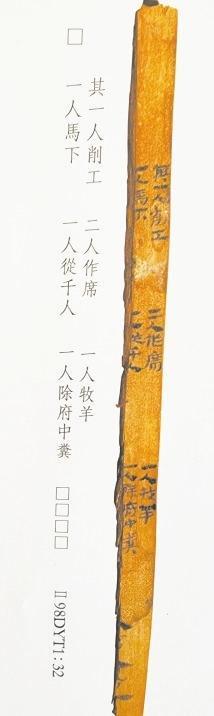 簡7是都尉府戍卒日作簿,戍卒分工簡明清楚。“削工”用紅柳、胡楊木削制簡牘。作席,疏勒河沿岸生長著大量芨芨草、蘆葦,戍卒用來編制席笆,用于防潮御寒。疏勒河沿岸水草豐茂,適宜放牧。“一人牧羊”可知,養(yǎng)牛、羊供都尉府吏員食用。“一人馬下”,由于缺當時的語言環(huán)境,釋義模糊。千人是都尉府中級軍官職務。除府中糞,清除廁所糞便。