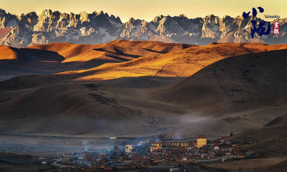 遠處連綿的群山白雪皚皚,山下青黃的草甸、安靜的藏式小村、飄蕩的經(jīng)幡、裊裊炊煙,勾勒出一幅美麗的畫。