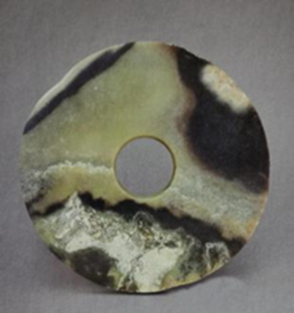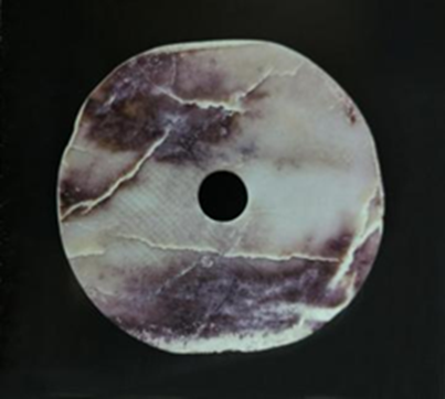 玉璧(編號總0129:4)直經(jīng)13.8厘米,單面鉆孔,大端孔徑5.2厘米,小端孔徑4.8厘米,璧面厚度不均勻,0.4~0.65厘米。