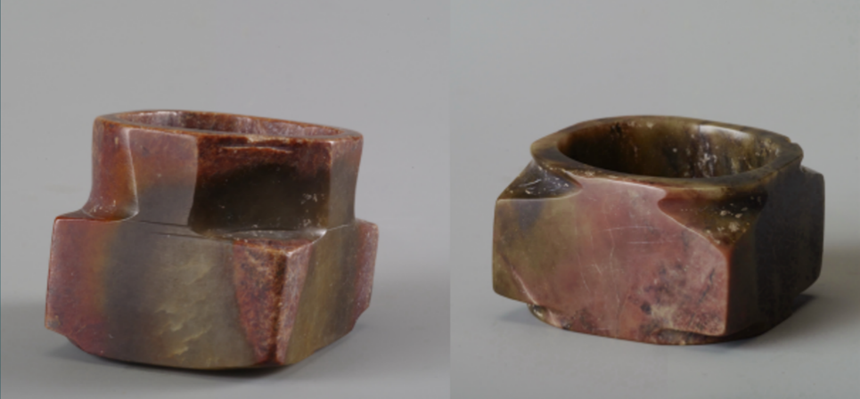 根據(jù)以上兩件玉琮形狀和材質(zhì)顏色比對,它們原為一件較大的玉琮被切割成兩件。