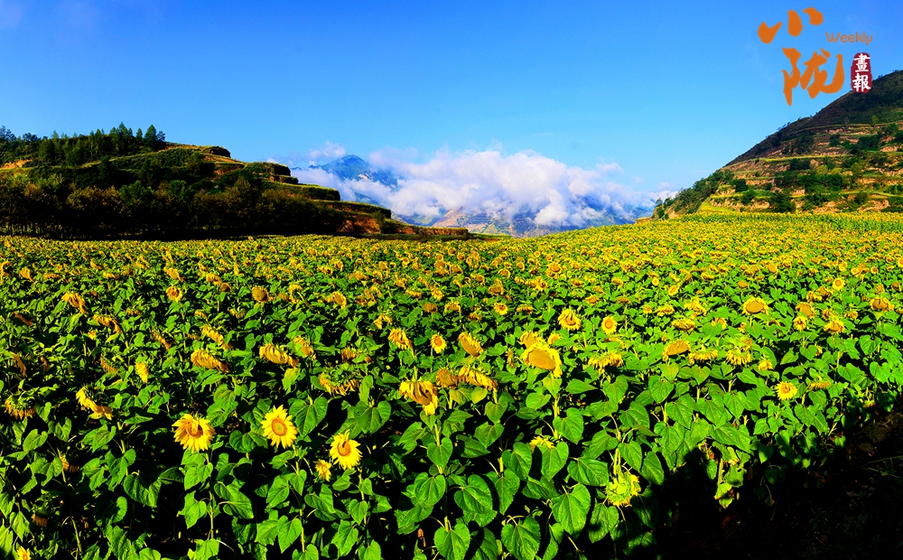 盛開的向日葵,迎著朝陽,競相綻放,婀娜多姿,在藍天白云下,卷起花的浪朵,匯聚成碧波蕩漾、金光閃閃的海洋,讓人心曠神怡。