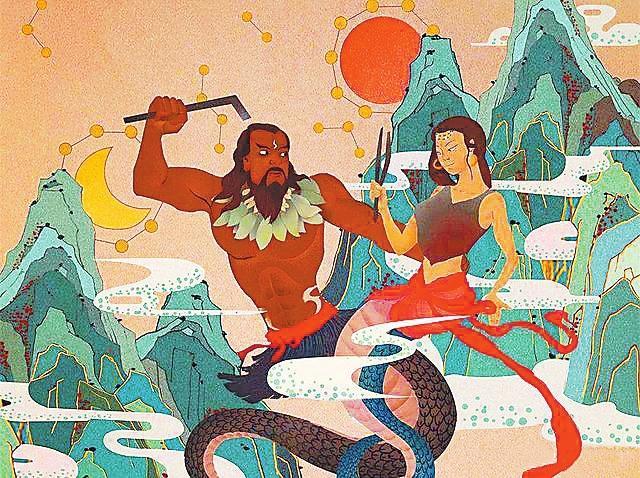在天地還沒形成,世界處于混沌狀態(tài)時,已有伏羲、女媧二神,他們結(jié)為夫婦,生子四人。他們開辟了天地,是因為懂得萬物參化的法度。為此,他們跋山涉水觀察山川自然,并疏通山陵,使山川與四海通氣,協(xié)和陰陽,使天地星辰有序運轉(zhuǎn)。當時沒有時序日月,他們制定了歷法,讓四個兒子輪流協(xié)理和代表四時。又過了一千數(shù)百年,帝俊生出日月,從此九州太平,山陵安靖。四神造了天蓋并用五色木的精華加固天蓋,使它旋轉(zhuǎn)。炎帝又讓祝融助四神奠定三天四極,敬事九天,以求太平。帝俊又制定日月運行的規(guī)則。后來,共工制定了十天干和閏月,分一天為宵、朝、晝、夕,歷法更為準確。于是,百神司職、日月有序、風和雨順的世界形成了。