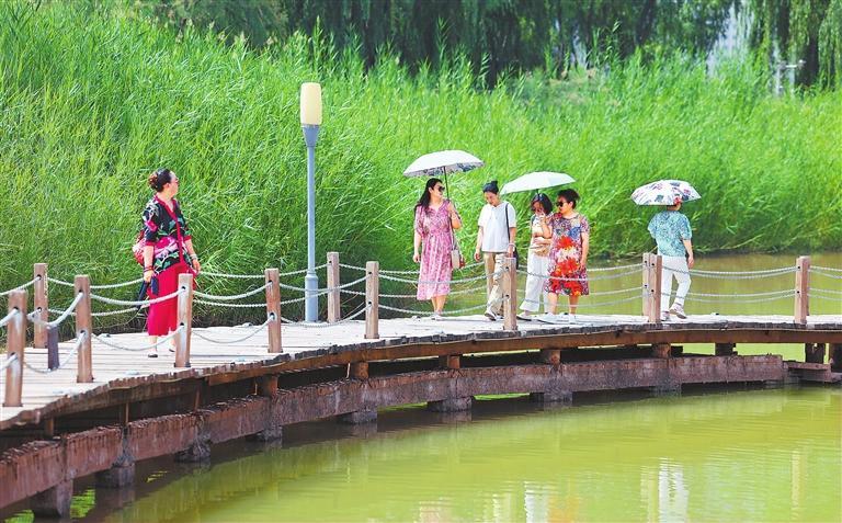 盛夏時(shí)節(jié),蘭州銀灘濕地公園綠意盎然、空氣清新。游客紛紛來(lái)到這里,享受炎炎夏日的片刻清涼。