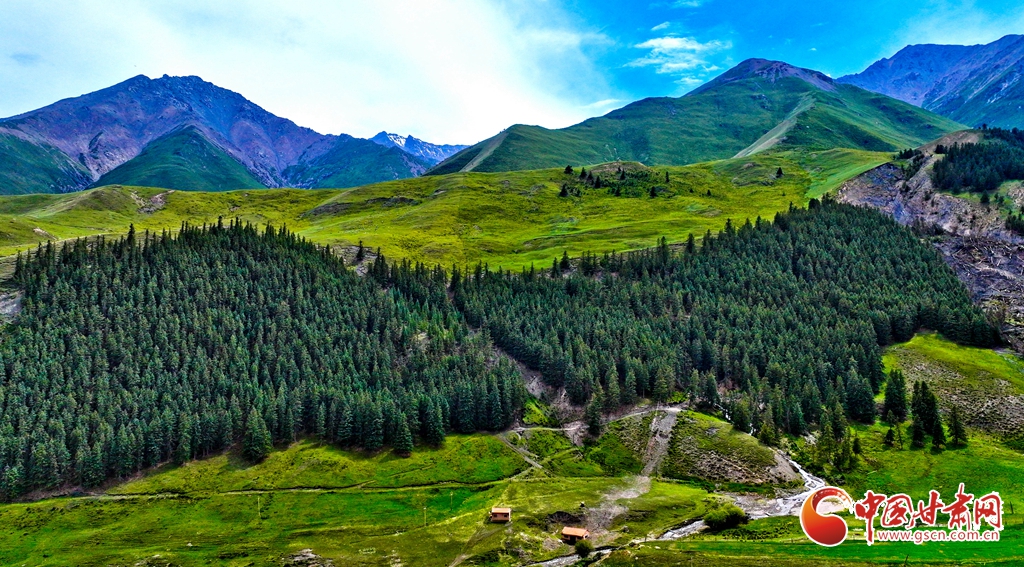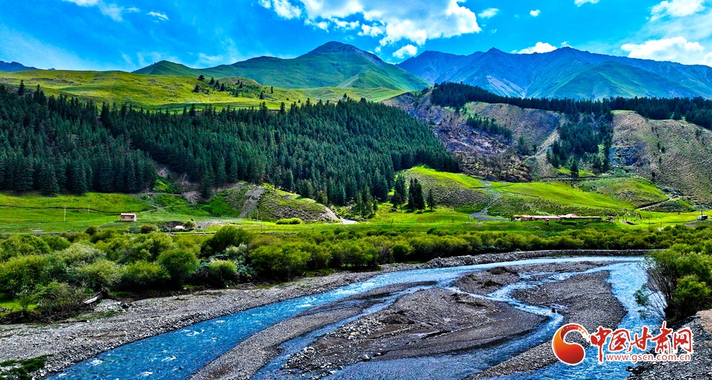7月2日,祁連山國家公園甘肅省張掖市肅南裕固族自治縣大河鄉(xiāng)段,在高原藍天白云映襯下,群山環(huán)抱、 雪峰高聳,鳥鳴聲陣陣的濕地、奔騰不歇的黑河水、猶如“巨幅綠毯”的草原,勾勒出一幅風光壯美的生態(tài)畫卷。