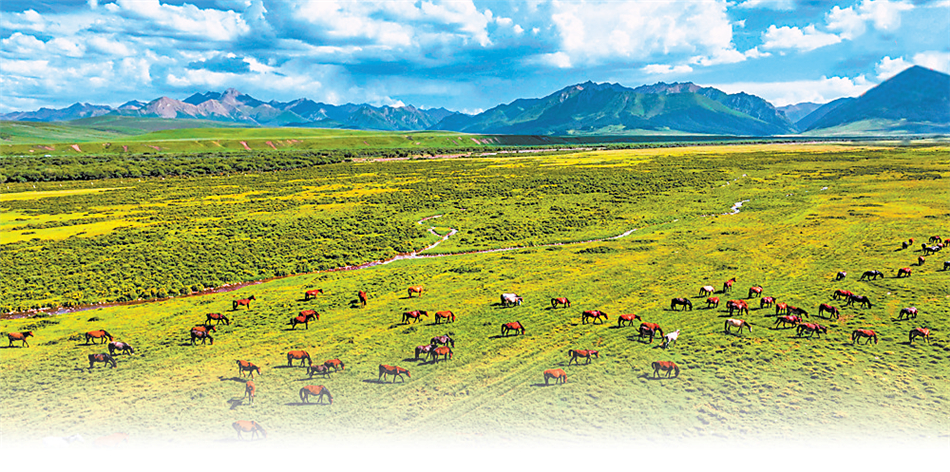 白雪皚皚的祁連山下,一眼望不到邊的大片牧草青翠碧綠,色彩斑斕的野花競相開放,擁有百萬畝草原的山丹馬場如巨幅彩色畫卷徐徐展開。