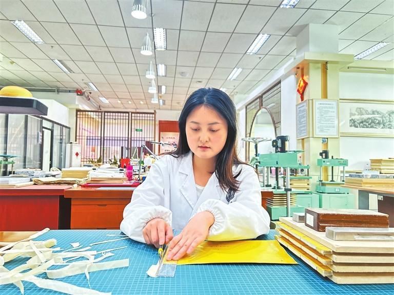 今年23歲的羅雪瑞是保護中心里的古籍修復(fù)師。她告訴記者:“在學(xué)校時學(xué)的是工藝美術(shù)品設(shè)計專業(yè)書畫裝裱方向,需要很強的動手能力,這為古籍修復(fù)工作打下了很好的基礎(chǔ)。”