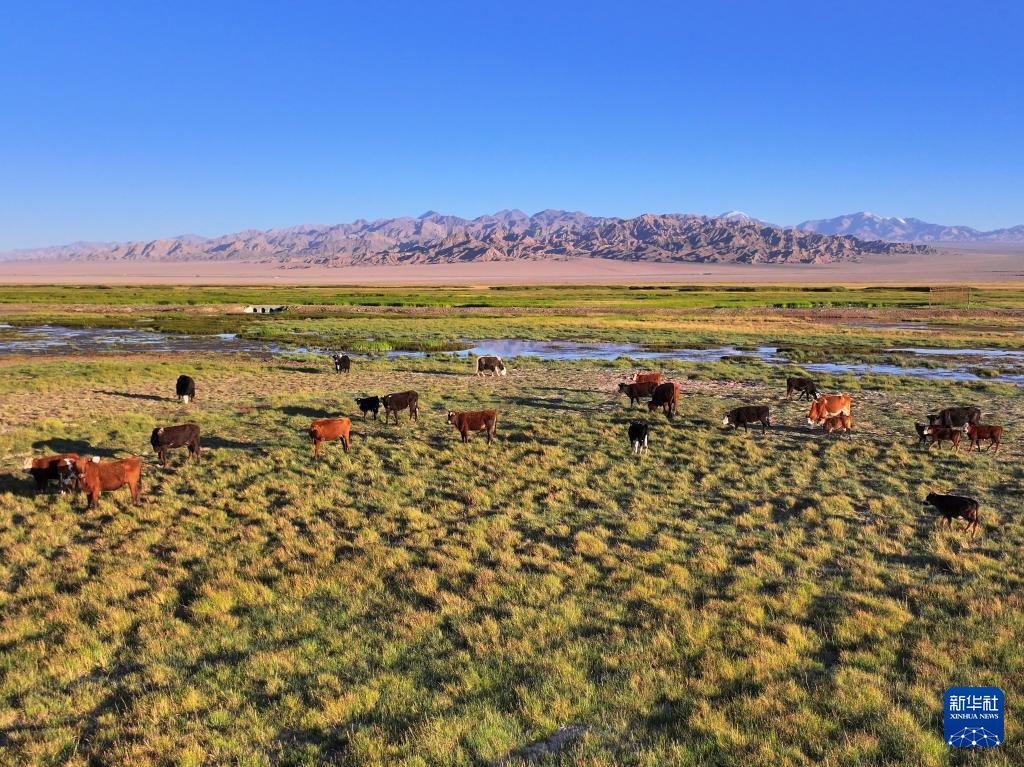 盛夏時節(jié),地處甘肅省酒泉市阿克塞哈薩克族自治縣阿伊納鄉(xiāng)境內(nèi)的大、小蘇干湖濕地,綠草如茵,牛羊成群,呈現(xiàn)出一幅生機勃勃的草原生態(tài)畫卷。