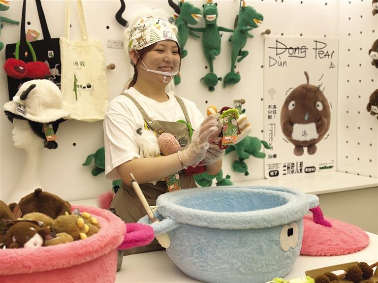 在甘肅省博物館藝術(shù)生活館的購物專區(qū),各種食材被做成了毛絨玩具,統(tǒng)一放進加大號的毛絨砂鍋,顧客還可以根據(jù)口味“私人訂制”,最后得到一把全食材版的玩具花束。不少網(wǎng)友看過視頻后,留言“很符合年輕人的‘口味’。”