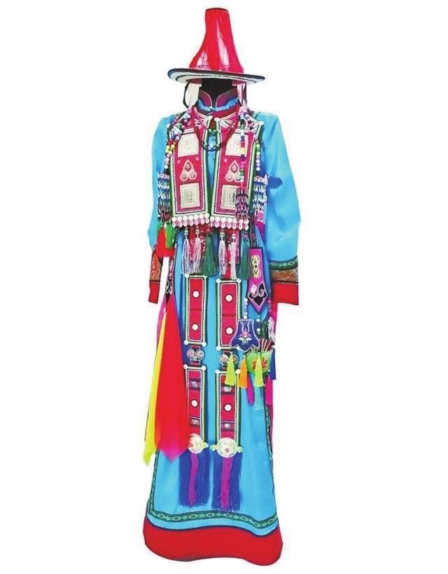 女性婚服是最隆重的,很多婚后日常服裝也在此時(shí)備好。女性婚服中最具辨識度的是頭面,長條形頭面佩戴在女子的三條長辮子上,胸前兩條,背后一條。多見布制的頭面,綴上珊瑚、綠松石、瑪瑙等,也有用紅牛皮底、黑或紅色絲絨底的頭面,鑲上銀牌、蜜蠟、珊瑚、松石等飾物,背后的一條頭面下方垂一顆紅珊瑚,上面鑲23塊白色海螺磨制的圓片,這種傳統(tǒng)頭面總重量約在五到七斤左右。傳統(tǒng)女性婚服多用藍(lán)色和綠色,以區(qū)別于著紅色服裝的“點(diǎn)格爾汗”天神。隨著文化的交流變化,對服裝色彩的禁忌逐漸消解,黃色、米黃色、紅色等色彩也常被新娘穿戴。