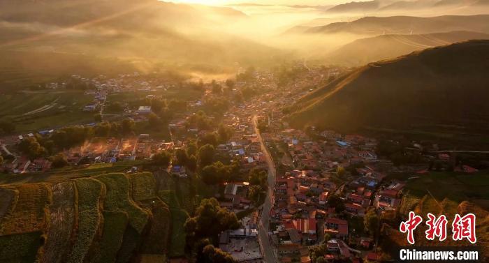 8月14日晚,蘭州市榆中縣馬坡鄉(xiāng),夕陽(yáng)在云海里翻滾,映照大地和村莊城鎮(zhèn),美不勝收。圖為日落映照城鎮(zhèn)。牛遠(yuǎn)明 攝