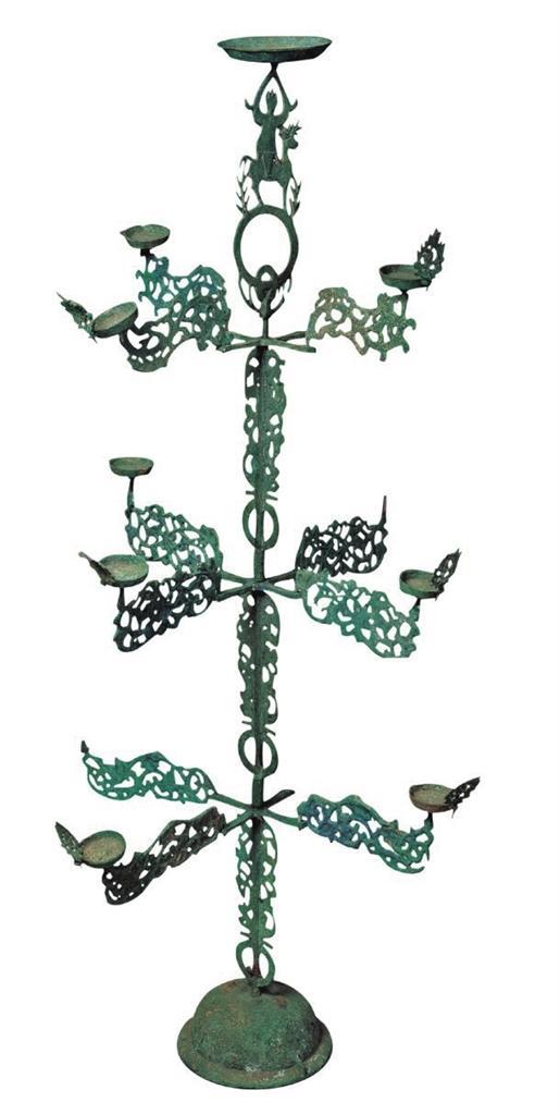 ▲1969年出土于武威市雷臺(tái)漢墓。燈呈樹(shù)形,由燈盞、葉、干枝和座等部分組成。燈座為覆缽狀,飾瑞獸紋和云氣紋。燈的主干為三段套插而成,每段均飾有連環(huán)和鏤空葉片,段與段銜接處各有一個(gè)十字形托架。十字托橫向四出,四端各飾透雕花葉一個(gè), 每層花葉紋飾各不相同,葉端承托小燈盞一只,燈盞外沿各有桃形葉飾一個(gè),象征火焰。主干頂端為鏤雕仙人騎鹿形花飾,仙人雙臂高舉托一大燈盞。原有燈13盞,現(xiàn)存9盞。