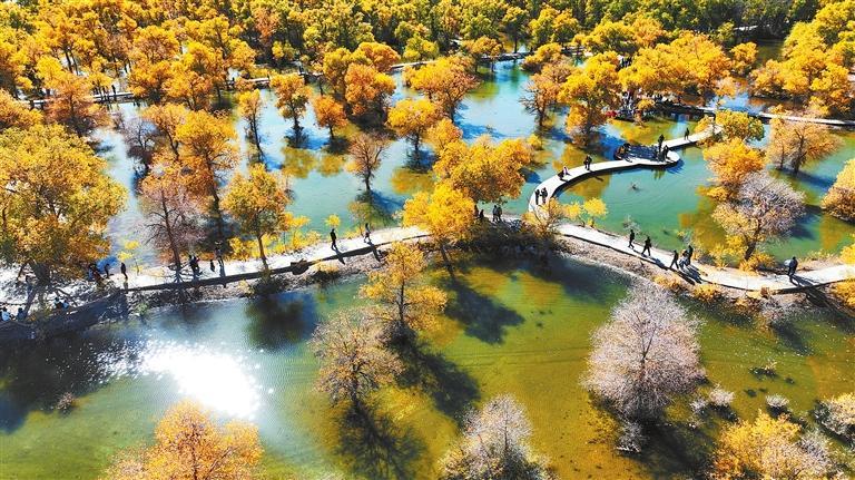 10月2日,游客在金塔沙漠胡楊林景區(qū)欣賞胡楊美景。新甘肅·甘肅日報(bào)通訊員 曹紅祖