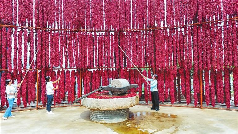 位于甘谷縣安遠(yuǎn)鎮(zhèn)上河灣村的甘肅隴上椒農(nóng)業(yè)科技(集團(tuán))有限公司,工作人員正在晾曬辣椒。新甘肅·甘肅日報通訊員 王啟寧