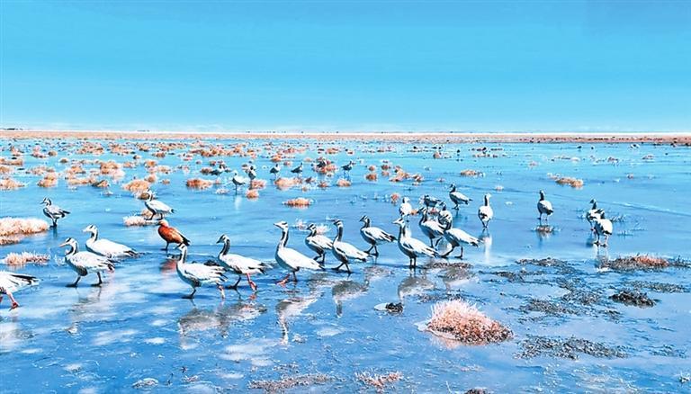 在這片濕地上,黃河的支流蜿蜒曲折,形成各式各樣的曲線。陽光下,這些彎彎曲曲的大小沼澤,猶如一條條銀色的絲帶,閃閃發(fā)光。觸手可及的藍天白云無際無涯,像洗滌過似的,亮得耀眼,牛羊滿山坡,宛如散落在人間的珍珠。這種原始的自然美景和豐富的生態(tài)資源,讓阿萬倉濕地成為一個理想的旅游目的地。