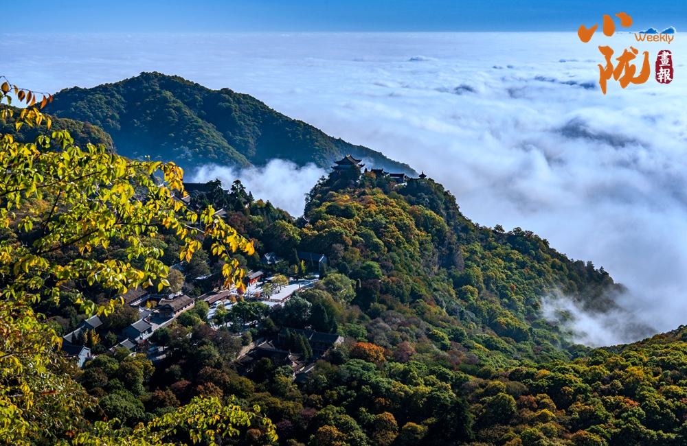 一葉知冬,遍地金黃。五彩斑斕的林木與古香古色的建筑、遠處的山巒云霧相映成趣,盡顯詩意之美。