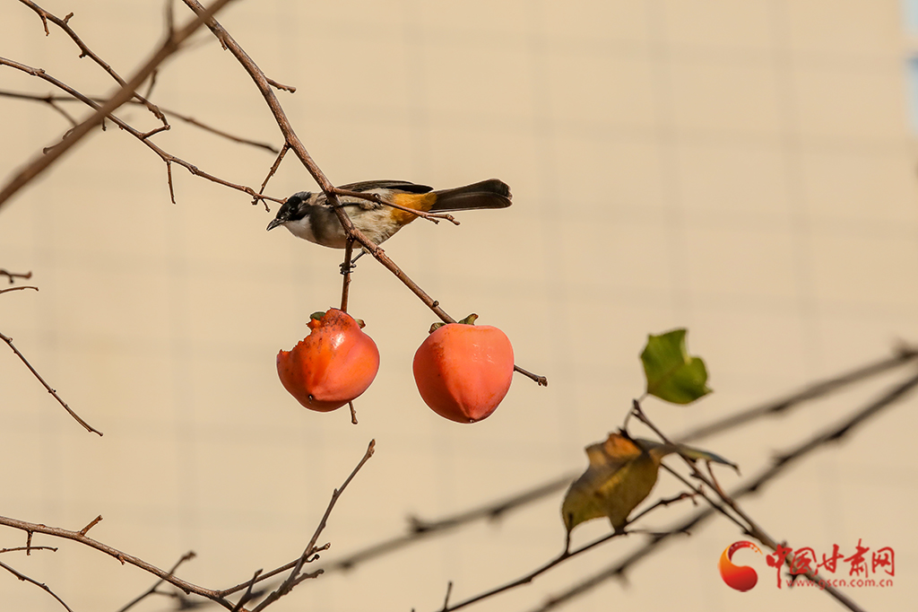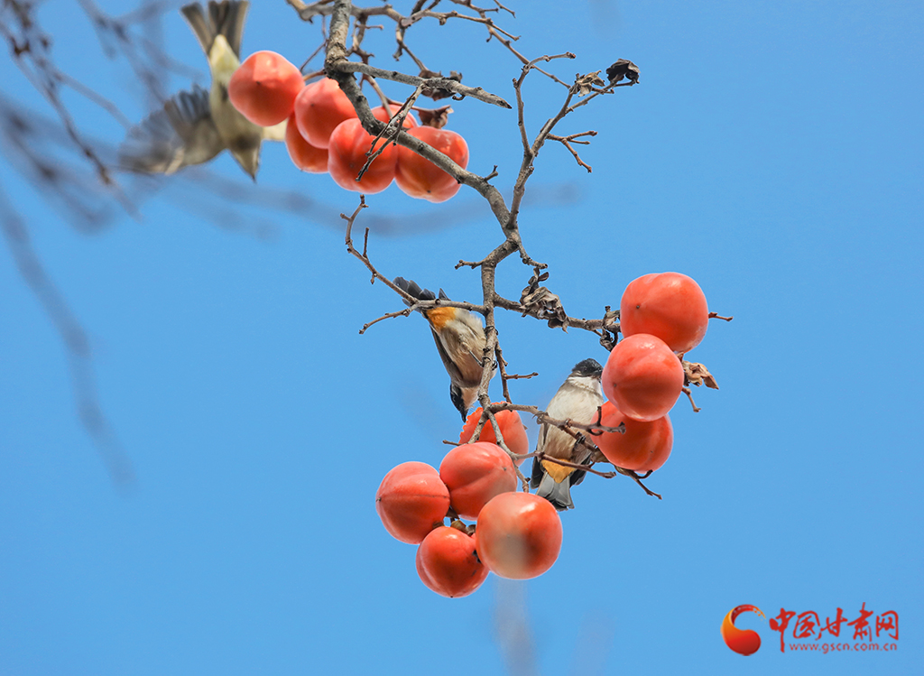 繁華落盡,枝條上一簇簇、一叢叢火紅的柿子在微風中搖曳,吸引麻雀前來“聚餐”。麻雀們時而啁啾歡唱,時而蹦跳覓食,小巧的身影與柿子交織在一起,勾勒出一幅生動的冬日畫卷。