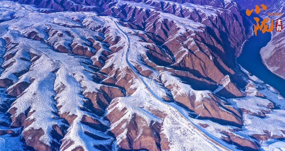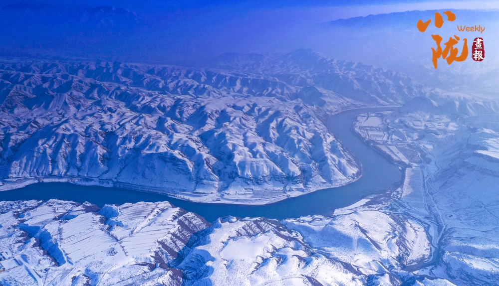 蜿蜒的黃河猶如一條藍(lán)絲帶飄舞在白雪覆蓋的山間、田野,兩岸被雪裝扮得格外壯麗,從空中俯瞰,宛若一幅水墨丹青畫。