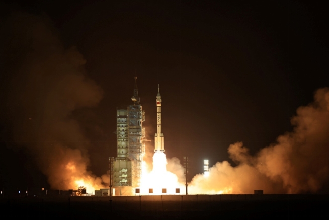 今朝再啟新驕,引無(wú)數(shù)英雄競(jìng)弄潮。念酒泉蓄勢(shì),六環(huán)繞地;文昌送遠(yuǎn),八陣沖霄。神箭飛馳,雄姿耀世,廣宇閑庭信步遙。征程上,續(xù)航天偉業(yè),風(fēng)勁旗飄。