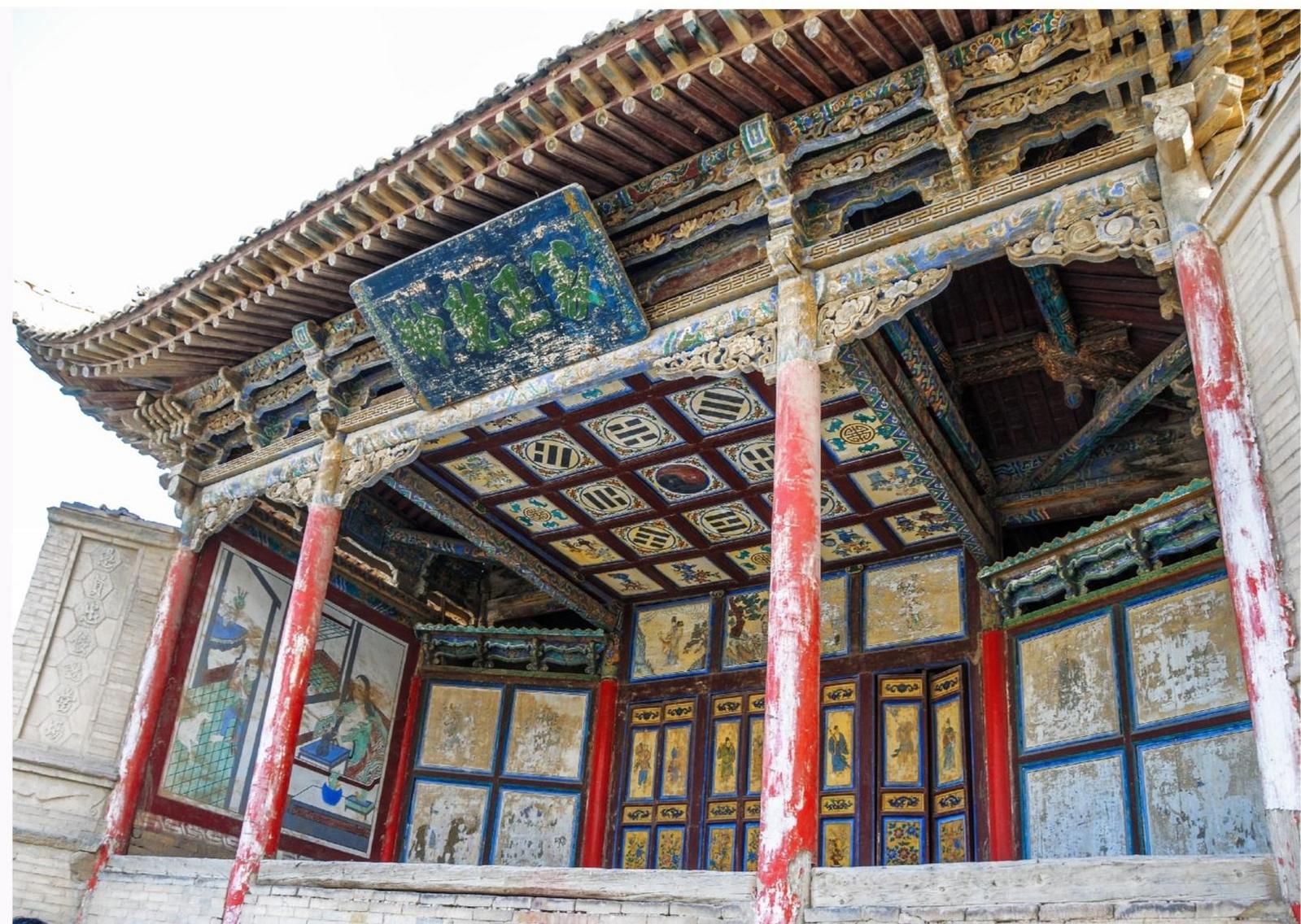 關帝廟戲樓(現(xiàn)存),關帝廟又稱武安王廟。明朝中期修建,萬歷六年(公元1578年)奉命鎮(zhèn)守嘉峪關的酒泉人佘動帶頭重修。乾隆五十七年(公元1792年),游擊將軍袋什衣主持重修,關帝廟戲樓是當時守城官兵、城內居民及過往商旅的娛樂場所。戲樓位于朝宗門斜對面,南閘門內側,關帝廟對面。它的形制是典型的中國傳統(tǒng)古典戲臺。關帝廟戲臺上就有一副意義深遠的對聯(lián),在兩側的八字屏風磚上刻有:“離合悲歡演往事,愚賢忠佞認當場。”