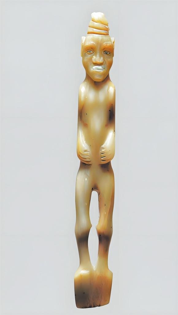 玉人形鏟高17.6厘米,1967年靈臺(tái)縣白草坡M1出土。圓雕工藝,人物裸體站像。發(fā)辮虎首蛇身盤(pán)成堆髻。長(zhǎng)臉,闊鼻,深眼窩,大耳,厚唇前突,兩手捧腹,兩腿間呈“8”形鏤空,雙足并攏作鏟形。