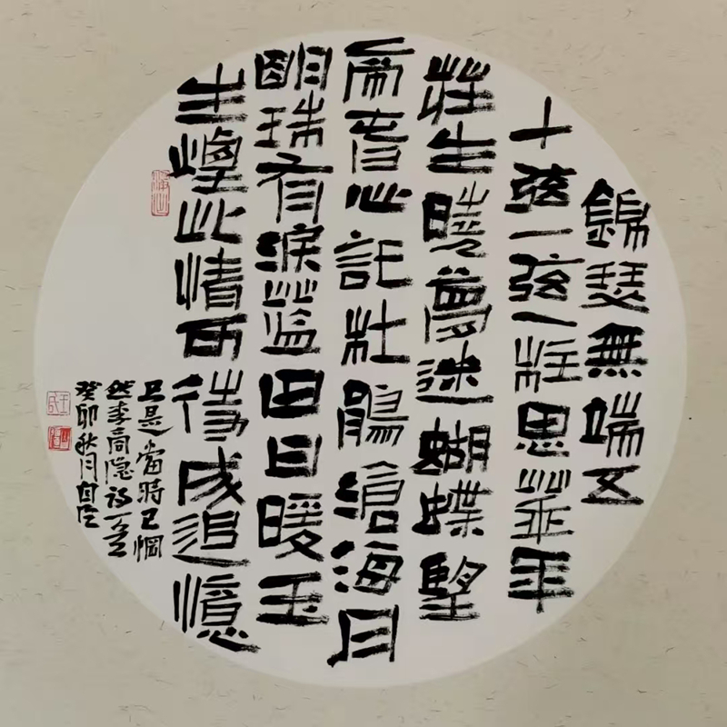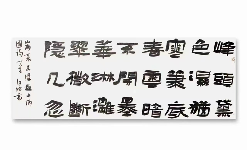 王自強的隸書植根于《西狹頌》的金石氣,又融入個人創(chuàng)新。他的作品《李白古風其一》在2021年“中國書法·年展”中脫穎而出,以古樸厚重的筆法、靈動多變的章法,位列全國前51名,成為成縣首位躋身國家級書法大展的藝術(shù)家。2025年,他的隸書作品再次入選全國第五屆隸書作品展,在15214件投稿中脫穎而出,展現(xiàn)出對漢隸藝術(shù)的深刻理解與創(chuàng)新表達。