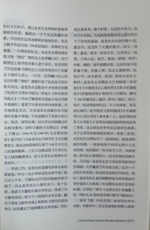 傳奇之四,金老先生是撰寫多種文體的探索者。作為一名小學(xué)畢業(yè)的農(nóng)家子弟,能認(rèn)識(shí)上千字,了解標(biāo)點(diǎn)符號(hào)的功能就非常不錯(cuò)了,而金老先生從小喜歡學(xué)習(xí),肯于鉆研,閱讀了大量的古典文學(xué)作品,背誦了不少唐宋詩(shī)詞,研習(xí)了一批現(xiàn)代文學(xué)名著,翻爛了兩本《新華字典》和兩本《現(xiàn)代漢語(yǔ)詞典》,從而奠定了他深厚的文學(xué)功底。同時(shí)他注重思考,善于積累,在創(chuàng)作中學(xué)習(xí),在學(xué)習(xí)中實(shí)踐,為他熟練掌握各種文體寫作打下了堅(jiān)實(shí)的基礎(chǔ)。金老先生的創(chuàng)作除小說(shuō)、童話外,還創(chuàng)作了大量的散文、雜文、詩(shī)歌、童謠、寓言、報(bào)告文學(xué)、文藝評(píng)論、戲劇、小戲小品、曲藝、歌曲、彈唱、相聲、快板、楹聯(lián)、連環(huán)畫腳本等,這些作品不但數(shù)量可觀、質(zhì)量上乘,而且主題鮮明、弘揚(yáng)正氣,成為愛黨、愛國(guó)、愛家鄉(xiāng)的鄉(xiāng)土教材。金老先生受聘在《蘭州晚報(bào)·農(nóng)村版》《蘭州晚報(bào)》《心理世界》《青少年攝影報(bào)》《質(zhì)量服務(wù)報(bào)》等報(bào)刊工作期間,撰寫了300多篇消息、通訊、特寫、側(cè)記、專訪、短評(píng)、綜述等新聞作品,不少有深度、有見地的稿件,還刊登在《新民晚報(bào)》《羊城晚報(bào)》《人民日?qǐng)?bào)》(海外版)上。他采寫的消息《義犬救人》獲得全國(guó)晚報(bào)新聞獎(jiǎng)消息類二等獎(jiǎng),這讓報(bào)社許多專業(yè)記者好生羨慕。為了讓采寫的新聞更加真實(shí)、形象、直觀,金老先生自費(fèi)購(gòu)買了一部照相機(jī),隨身攜帶隨時(shí)拍攝,一批新聞?wù)掌惋L(fēng)光照片又見諸報(bào)端。他拍攝的一些傳統(tǒng)手工藝、風(fēng)物景觀、農(nóng)村紅白喜事照片,成為珍貴的圖像資料??梢哉f(shuō),金老先生在文學(xué)創(chuàng)作和新聞寫作領(lǐng)域,幾乎囊括了所有的文體,這對(duì)一個(gè)農(nóng)民作家來(lái)說(shuō),在全國(guó)也是絕無(wú)僅有的。同時(shí),金老先生注重挖掘整理省內(nèi)具有較高史學(xué)價(jià)值的人文典故,先后撰寫各類文史資料83篇,還承擔(dān)了家鄉(xiāng)《金崖史話》的編纂工作,同時(shí)為16部電視專題片撰寫了解說(shuō)詞。