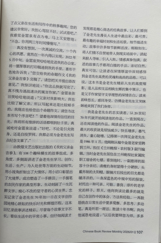 由敦煌文藝出版社出版的《我的父親金吉泰》,有108個(gè)趣味橫生的故事組成,多角度、多側(cè)面講述了金老先生學(xué)習(xí)、創(chuàng)作、生活、生產(chǎn)、為人處世等方面的生動(dòng)細(xì)節(jié),用小視角折射出了大情懷,用小切口彰顯出了大境界,成功塑造了一手耕田、一手握筆的農(nóng)民作家的典型形象,生動(dòng)刻畫了一生沉醉文學(xué)、癡心不改的堅(jiān)守者的心靈世界,忠實(shí)記錄了金老先生70年如一日在文學(xué)創(chuàng)作園地精心耕耘的快樂(lè)時(shí)光和輝煌歷程。這本回憶錄故事講述精彩,盡管每個(gè)故事文字不長(zhǎng),看似生活中的平常小事,但仔細(xì)閱讀才發(fā)現(xiàn)都是精心篩選的經(jīng)典故事,讓人們看到了金老先生漫長(zhǎng)人生途中最出彩、最可貴、最有趣的幸福時(shí)刻和生活場(chǎng)景。細(xì)節(jié)描述生動(dòng),故事中許多細(xì)節(jié)新鮮活潑、栩栩如生,將人們情不自禁地帶入到現(xiàn)實(shí)場(chǎng)面中,讀起來(lái)耐人尋味、引人入勝。情感真摯飽滿,敘述的故事幾乎都用白描的手法,親切自然,真實(shí)可信,讓讀者在深情厚誼中深刻感悟到金老先生高貴的靈魂和高尚的品格??梢哉f(shuō),這本書是金老先生精彩人生的高度縮影,是人品和文品相映生輝的集中展示,也是父子作家堅(jiān)守文學(xué)理想的深情告白,讀來(lái)韻味悠長(zhǎng),感同身受,仿佛金老先生又笑瞇瞇地來(lái)到了我們身旁。