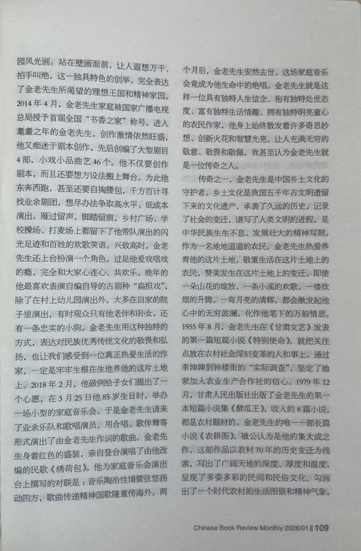 從此之后,我與金老先生的交往越來(lái)越密切,交流的話題也越來(lái)越廣泛,每次見面,他給我最多的就是鼓勵(lì):“小楊啊,你在《人民日?qǐng)?bào)》上發(fā)表的寫奧運(yùn)會(huì)的散文,看得我都激動(dòng)了。”“小楊啊,《詩(shī)刊》上發(fā)表大作了,值得祝賀!”“小楊啊,你的創(chuàng)作達(dá)到了新的水準(zhǔn),都登上國(guó)刊《人民文學(xué)》了。”有一次,金老先生得知我在《星星》詩(shī)刊舉辦的首屆農(nóng)民工詩(shī)歌大獎(jiǎng)賽中獲獎(jiǎng)的消息后,專門打來(lái)電話:“小楊啊,向你表示祝賀,你的獲獎(jiǎng)作品表達(dá)了我們農(nóng)民工的心聲!”金老先生與人相處,傳遞的絕對(duì)是正能量,從我與他交往的30多年時(shí)光里,從來(lái)沒有聽到過(guò)他非議別人。后來(lái)才慢慢發(fā)現(xiàn),他有與眾不同的精神境界、質(zhì)樸品格、為人方式和處事態(tài)度,他靈魂深處永遠(yuǎn)流淌著向善、向上、向真、向美的價(jià)值取向,渾身上下始終洋溢著執(zhí)著、豁達(dá)、樂(lè)觀、寬容的人格魅力。一個(gè)地地道道的農(nóng)民,從當(dāng)年只有小學(xué)文化程度,靠勤奮自學(xué)70年堅(jiān)持筆耕不輟,出版各種作品集25部,共計(jì)400多萬(wàn)字,被中共甘肅省委、甘肅省人民政府授予“甘肅省文藝終身成就獎(jiǎng)”。對(duì)一個(gè)農(nóng)民來(lái)說(shuō),這在全國(guó)也是屈指可數(shù)的。年近80歲的時(shí)候,在患嚴(yán)重眼疾幾乎導(dǎo)致雙目失明的情況下,每天堅(jiān)持寫作兩三千字,用10個(gè)月時(shí)間,完成了45萬(wàn)字的長(zhǎng)篇小說(shuō)《農(nóng)耕圖》,榮獲甘肅省文學(xué)藝術(shù)類政府最高獎(jiǎng)——敦煌文藝獎(jiǎng),金老先生的頑強(qiáng)毅力和拼命勁頭也是罕見的。20世紀(jì)80年代初,他以家鄉(xiāng)榆中縣金崖鄉(xiāng)文化站為依托,創(chuàng)辦了全省第一個(gè)農(nóng)民文學(xué)社——苑川文學(xué)社,舉辦“文學(xué)創(chuàng)作講習(xí)班”,吸引方圓村鎮(zhèn)100多名“泥腿子”文學(xué)愛好者參與其中,每當(dāng)經(jīng)他修改、推薦的作品發(fā)表后,年過(guò)半百的他總是騎上自行車跑幾十公里路,喜滋滋地將樣報(bào)樣刊送到作者手里,金老先生樂(lè)此不疲為文學(xué)愛好者全方位服務(wù)的情懷,在當(dāng)下是不多見的,更加顯得彌足珍貴。興趣廣泛的金老先生在晚年時(shí)突發(fā)奇想,在老宅院子里啟動(dòng)了家庭美化工程,自己設(shè)計(jì)、自己施工,在自家院子西墻上,用五顏六色的小石子創(chuàng)作了一幅長(zhǎng)八米、寬二米的巨型壁畫,畫面上有紅日、山水、碌碡、西瓜、樹木、小鹿、大雁、人物,還有太陽(yáng)灶、飛機(jī)、衛(wèi)星,好一幅天人合一的田園風(fēng)光畫。站在壁畫面前,讓人遐想萬(wàn)千、拍手叫絕,這一獨(dú)具特色的創(chuàng)舉,完全表達(dá)了金老先生所渴望的理想王國(guó)和精神家園。2014年4月,金老先生家庭被國(guó)家廣播電視總局授予首屆全國(guó)“書香之家”稱號(hào)。進(jìn)入耄耋之年的金老先生,創(chuàng)作激情依然旺盛,他又癡迷于劇本創(chuàng)作,先后創(chuàng)編了大型劇目4部,小戲小品曲藝46個(gè)。他不僅要?jiǎng)?chuàng)作劇本,而且還要想方設(shè)法搬上舞臺(tái)。為此他東奔西跑,甚至還要自掏腰包,千方百計(jì)尋找業(yè)余劇團(tuán),想盡辦法爭(zhēng)取高水平、低成本演出。雁過(guò)留聲,腳踏留痕,鄉(xiāng)村廣場(chǎng)、學(xué)校操場(chǎng)、打麥場(chǎng)上都留下了他帶隊(duì)演出的閃光足跡和百姓的歡歌笑語(yǔ)。興致高時(shí),金老先生還上臺(tái)扮演一個(gè)角色,過(guò)足他愛戲唱戲的癮,完全和大家心連心、共歡樂(lè)。晚年的他最喜歡表演自編自導(dǎo)的古劇種“扁擔(dān)戲”,除了在村上幼兒園演出外,大多在自家的院子里演出,有時(shí)觀眾只有他老伴和孫女,還有一條忠實(shí)的小狗。金老先生用這種獨(dú)特的方式,表達(dá)對(duì)民族優(yōu)秀傳統(tǒng)文化的敬畏和弘揚(yáng),也讓我們感受到一位真正熱愛生活的作家,一定是牢牢生根在生他養(yǎng)他的這片土地上。2018年2月,他破例給子女們提出了一個(gè)心愿,在3月25日他85歲生日時(shí),舉辦一場(chǎng)小型的家庭音樂(lè)會(huì)。于是金老先生請(qǐng)來(lái)了業(yè)余樂(lè)隊(duì)和歌唱演員,用合唱、歌伴舞等形式演出了由金老先生作詞的歌曲。金老先生身著紅色的盛裝,親自登臺(tái)演唱了由他改編的民歌《繡荷包》。他為家庭音樂(lè)會(huì)演出臺(tái)上撰寫的對(duì)聯(lián)是:音樂(lè)陶冶性情管弦悠揚(yáng)動(dòng)四方,歌曲傳遞精神國(guó)歌隆重傳海外。兩個(gè)月后,金老先生安然去世,這場(chǎng)家庭音樂(lè)會(huì)竟成為他生命中的絕唱。金老先生就是這樣一位具有獨(dú)特人生信念、抱有獨(dú)特處世態(tài)度、富有獨(dú)特生活情趣、擁有獨(dú)特明亮童心的農(nóng)民作家,他身上始終散發(fā)著許多奇思妙想、創(chuàng)新火花和智慧光亮,讓人充滿無(wú)窮的敬意、敬畏和敬佩,我甚至認(rèn)為金老先生就是一位傳奇之人。