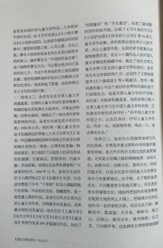 傳奇之二,金老先生是甘肅兒童文學(xué)的奠基者。甘肅的兒童文學(xué)創(chuàng)作是伴隨著共和國(guó)的誕生而發(fā)展壯大起來(lái)的,盡管起步較晚,但勢(shì)頭強(qiáng)勁,涌現(xiàn)出了一批優(yōu)秀作家和有影響的作品,金老先生就是其中的佼佼者。1956年6月,他的第一篇兒童文學(xué)作品《長(zhǎng)城南邊的草地上》在《甘肅文藝》發(fā)表,作品敏銳捕捉到新中國(guó)成立后逐步出現(xiàn)的城鄉(xiāng)差別這一現(xiàn)象,以犀利的筆觸、鮮活的語(yǔ)言,有力批駁了以城里人自居而形成的優(yōu)越感,立意高遠(yuǎn),思想深刻,內(nèi)涵豐富,手法新穎,受到社會(huì)各界的贊譽(yù)和廣大讀者的好評(píng)。1960年11月,金老先生創(chuàng)作的《小滿歷險(xiǎn)記》在《紅旗手》發(fā)表,作品成功塑造了外號(hào)“千里駒”的馬小滿聰明能干的形象,作品輕松活潑,情趣盎然,是一部質(zhì)量上乘的作品。金老先生作為甘肅杰出的兒童文學(xué)作家,寫得最多的是童話,成果最豐碩的也是童話。他先后在《兒童文學(xué)》《東方少年》《少年文藝》《幼兒文學(xué)》《童話報(bào)》等報(bào)刊發(fā)表300多篇童話作品,獨(dú)創(chuàng)了“田園童話”和“天生童話”,拓寬了童話題材創(chuàng)作的新天地,出版了《月牙泉的天馬》《小毛驢出國(guó)》《快樂(lè)的小公雞》等16部?jī)和膶W(xué)作品集,多次獲得全國(guó)優(yōu)秀少兒圖書獎(jiǎng)、冰心兒童圖書獎(jiǎng)、全國(guó)農(nóng)家書屋重點(diǎn)出版物推薦目錄,有五六十篇作品入選中國(guó)兒童文學(xué)精選和典藏書庫(kù),奠定了他在甘肅兒童文學(xué)界乃至全國(guó)兒童文學(xué)界的地位。金老先生在去世前的兩個(gè)月,還創(chuàng)作了《青蛙借雷聲》《小鎮(zhèn)典故》等6篇童話,他用一顆純真的童心與這個(gè)美好的世界和天真的孩子們深情告白。他是甘肅兒童文學(xué)的開創(chuàng)者、親歷者、實(shí)踐者和奠基者,他的成果已載入甘肅兒童文學(xué)乃至中國(guó)兒童文學(xué)的史冊(cè),正如著名作家安武林評(píng)價(jià):“在中國(guó)兒童文學(xué)作家之中,以農(nóng)民身份,抒寫兒童文學(xué)作品,終其一生,成就斐然者,唯此一人,金吉泰先生也。”