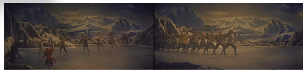 在表現行軍征程時,舞者以身體前傾的大跨步姿態(tài),沿群山布景走出巨大的“S”型曲線。這不是簡單的隊形變換,它首先在視覺上營造出千軍萬馬綿延不絕的雄渾意象。同時,“S”形曲線本身藝術化地傳達了“道路是曲折的,前途是光明的”這一革命哲理。舞者整齊劃一、重心下沉的堅定步伐,與沙幕光影營造出的風沙漫天效果相結合,共同體現紅軍在艱難險阻中依然定向不移的鋼鐵意志。