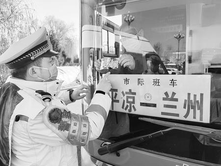 1月21日,蘭州市公安局交警支隊柳溝河高速公路大隊民警向參與春運車輛張貼平安標語。新甘肅·甘肅法制報記者王輝攝