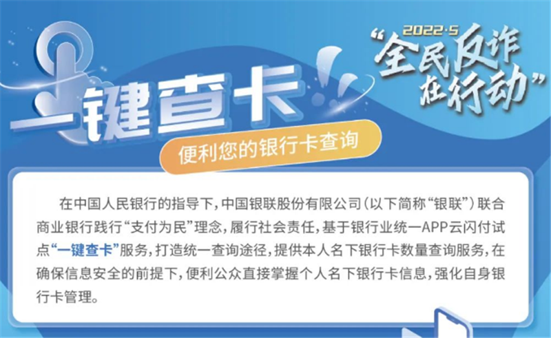 為解決群眾對(duì)于跨行銀行卡賬戶查詢的訴求,2021年12月,人民銀行指導(dǎo)中國銀聯(lián)股份有限公司聯(lián)合商業(yè)銀行基于銀行業(yè)統(tǒng)一APP云閃付試點(diǎn)“一鍵查卡”功能,打造統(tǒng)一查詢途徑,向公眾提供銀行卡數(shù)量、每張卡的銀行名稱、借貸記屬性、脫敏卡號(hào)等信息的查詢,在確保信息安全的前提下,便利公眾直接掌握個(gè)人名下銀行卡信息,強(qiáng)化自身銀行卡管理。