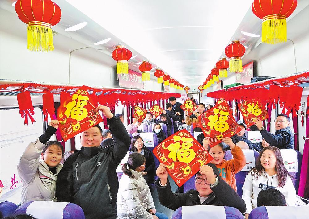 7504次“富民號(hào)”列車上張燈結(jié)彩,歡聲笑語。新春佳節(jié)來臨之際,無數(shù)人心懷著對(duì)家鄉(xiāng)的眷戀,踏上溫馨的回家之路。 新甘肅·甘肅日?qǐng)?bào)記者丁凱攝