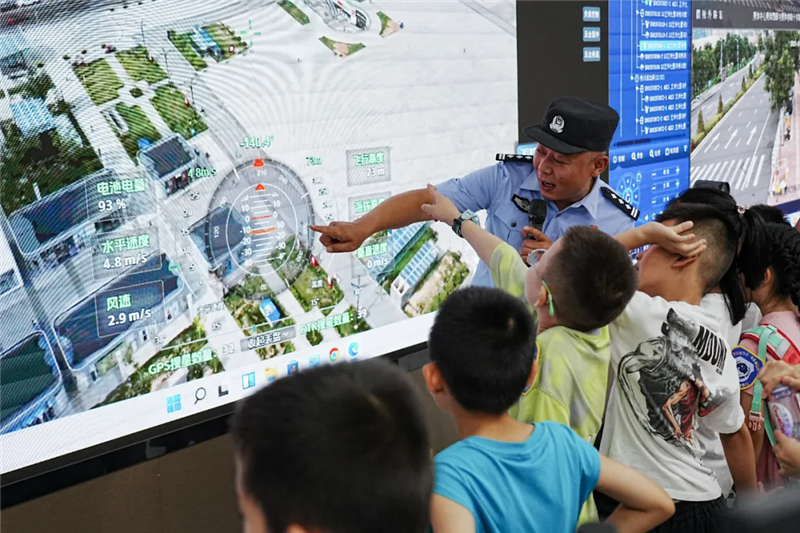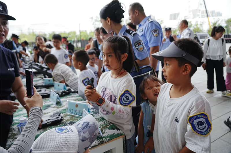 帶著興奮和期待,小朋友們的警營探索之旅開始了!在奧體中心警務(wù)站和警航作戰(zhàn)單元,他們沉浸式參觀了現(xiàn)代警務(wù)工作和警用無人機(jī)的指揮調(diào)度,直觀了解了公安工作的日常場(chǎng)景。另一邊,小朋友們?cè)诿窬闹笇?dǎo)下,一個(gè)個(gè)親手拿著警用武器裝備零距離“拍照打卡”,“這個(gè)好酷!”“看我的!”小朋友們的驚嘆聲此起彼伏。