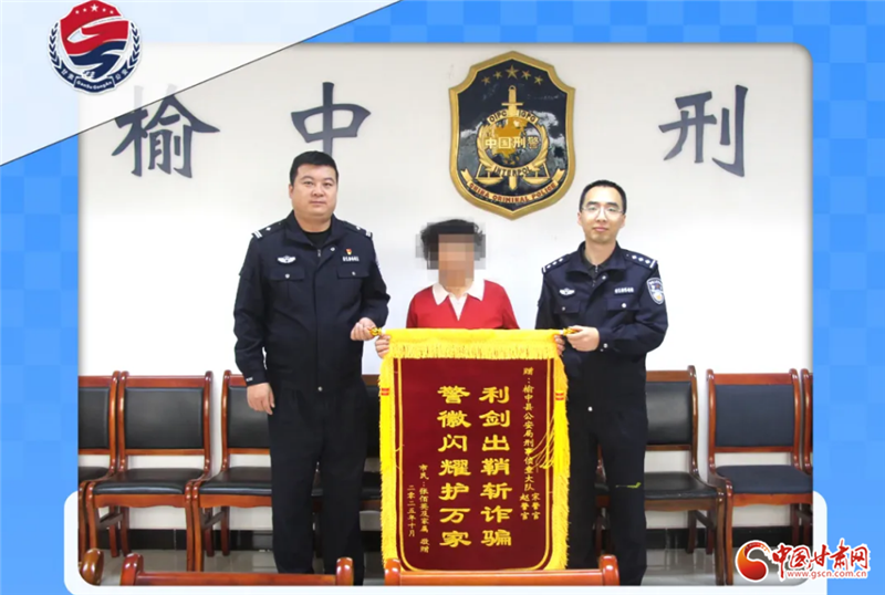 中國甘肅網(wǎng)11月3日訊(西北角·中國甘肅網(wǎng)記者 程?。┙?,蘭州市的張女士將一面印有“利劍出鞘斬詐騙 警徽閃耀護萬家”的錦旗,送到了榆中縣公安局刑警大隊辦案民警手中。